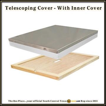 The telescoping outer cover is metal-clad for weather protection and extends over the hive body to help shed rain and improve durability in field conditions. The inner cover installs beneath the outer cover and assists with ventilation, moisture control, and prevents the bees from gluing the top cover directly to the hive body.
